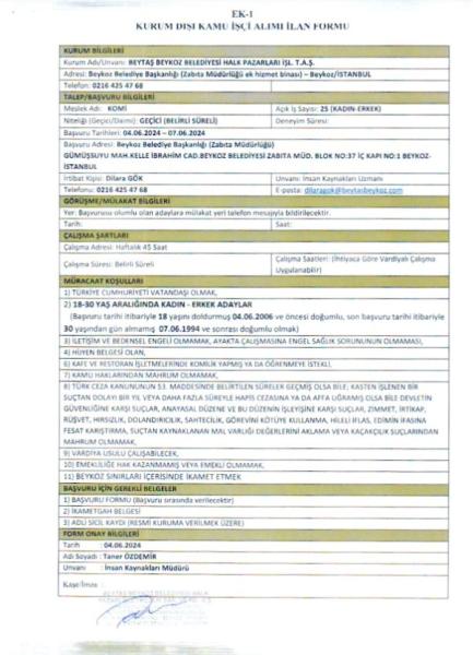 BEYTAŞ A.Ş. PERSONEL ALIM DUYURUSU (KOMİ)